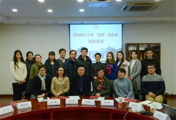 2018年1月24日,首屆華東理工大學“浩登”獎教金頒獎儀式在華東理工大學隆重舉行,我公司董事長沈健先生、董事會秘書胡艷女士受邀參加,出席本次頒獎儀式的還有有華理工商學院副院長董臨萍老師、華理工化工學院黨委副書記高藝霞老師、華理工材料學院黨委副書記戴誠安老師、華理工資環(huán)學院黨委副書記饒志雄老師、華理工商學院團委書記陳慶升老師、華理工商學院團委副書記丁一老師、華理工商學院校友中心袁竹君老師、馮承才老師、姜楠老師及獲獎師生代表。