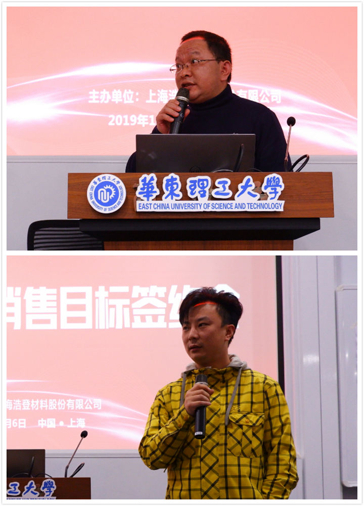 2019年上海浩登材料股份有限公司銷售目標(biāo)簽約會于2019年1月6日在上海華東理工大學(xué)商學(xué)院大樓401室舉行。公司董事長沈健先生、公司各職能部門負(fù)責(zé)人以及江蘇康樂佳材料有限公司總經(jīng)理吳天平先生、寧夏倬昱新材料科技有限公司總經(jīng)理趙春霞女士、銷售中心所有員工、上海健倬生物科技有限公司所有員工參加了本次會議。