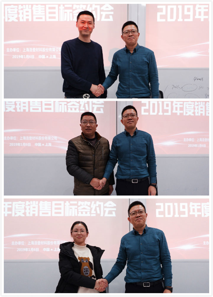 會議最后,公司銷售總監(jiān)王總、江蘇康樂佳吳總、寧夏倬昱新材料趙總分別與公司董事長簽訂了2019銷售目標(biāo)責(zé)任狀及分公司目標(biāo)責(zé)任狀。